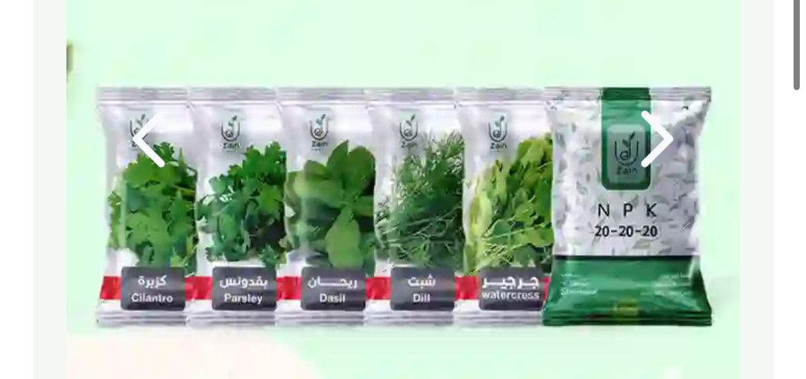 عرض الورقيات مكون من بذور ( جرجير + كزبرة + شبت +ريحان + بقدونس + سماد متوازن 100 جرام )