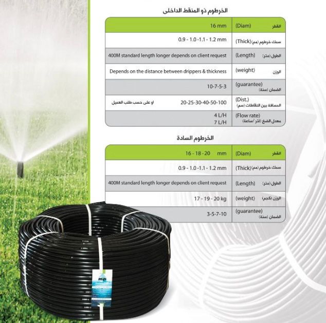 خراطيم ري مصنوعة من البولي إيثيلين عالي الجودة، بتصميم يتحمل الضغط والعوامل البيئية لفترات طويلة. مناسبة لجميع أنظمة الري الحديث، وتتوفر بمقاسات وأطوال مختلفة بما يناسب نوع المحصول وطبيعة التربة.